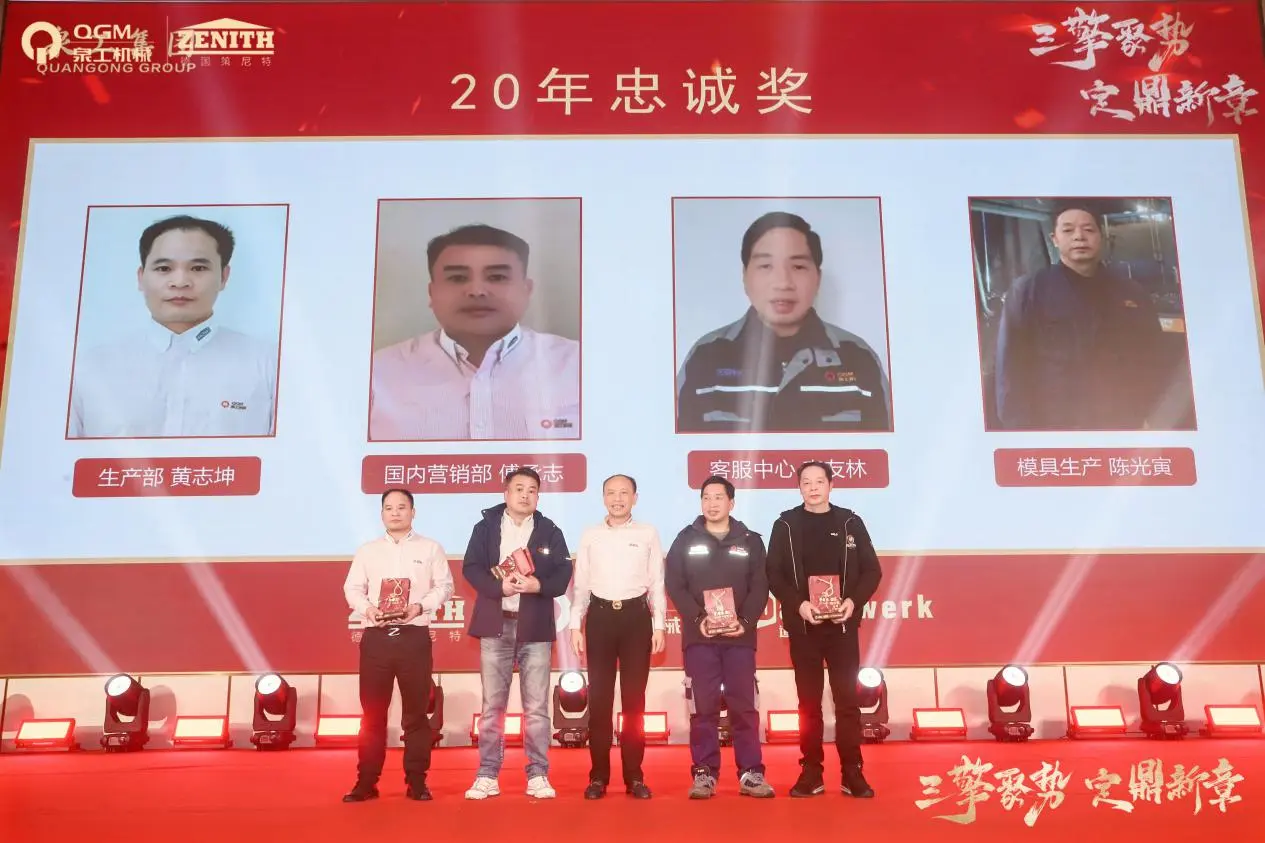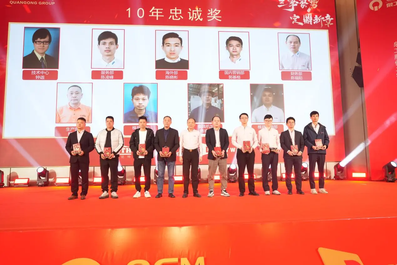 وخلال الاجتماع السنوي، أقيم أيضًا حفل كبير لتوزيع جوائز الولاء لمدة 10 سنوات و20 عامًا و30 عامًا. مجموعة من الموظفين الذين ساروا جنبًا إلى جنب مع الشركة ونماوا معًا صعدوا إلى المسرح، مما يدل بشكل كامل على الأساس المتين للتطور المطرد لشركة Quangong Machinery Co., Ltd. وثقافة الشركة الدائمة.